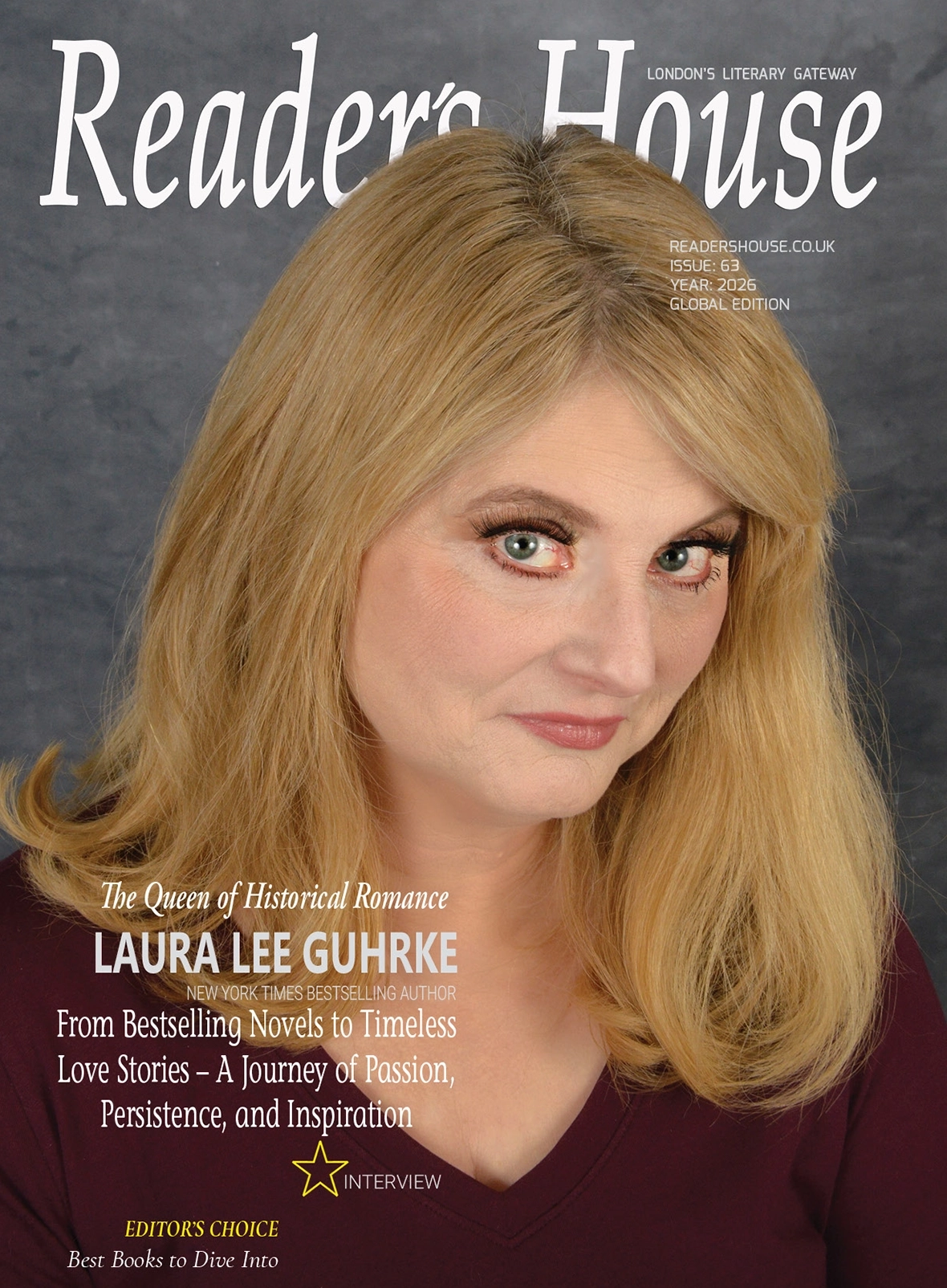 W hen it comes to the art of storytelling, certain writers transcend the boundaries of the page, evoking timeless emotion, vivid imagery, and narratives that captivate readers across generations. This issue, Reader’s House is honoured to feature Laura Lee Guhrke, a trailblazer in the world of historical romance, on our cover. With a career spanning thirty novels, two coveted Romance Writers of America RITA Awards, and a legacy etched across bestseller lists, Laura’s contribution to the literary world is not only prolific but iconic.